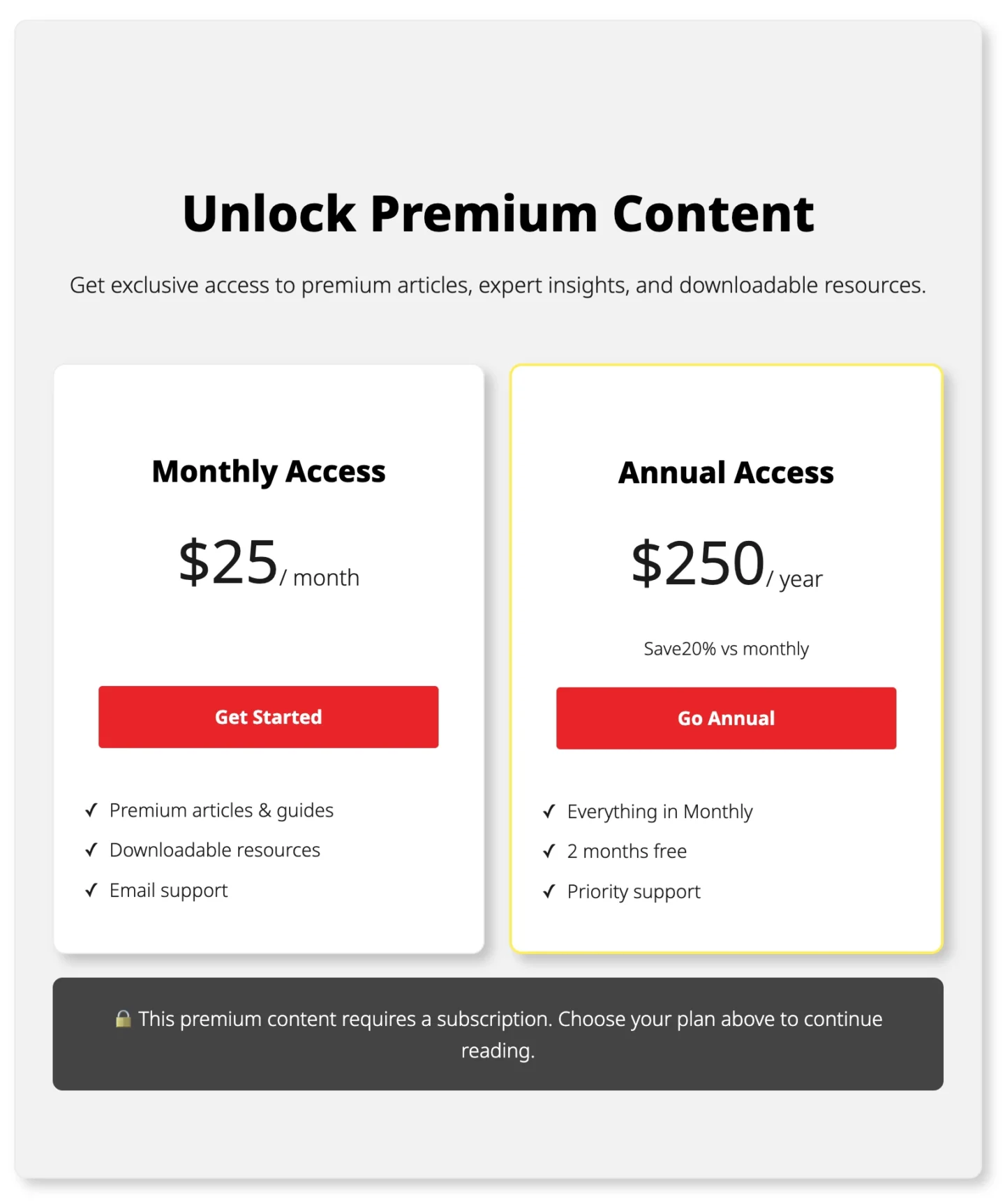 - Multiple Paywall Types: Hard paywall, teaser preview, blur overlay, redirect