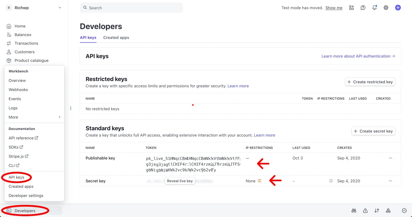 Let’s start by logging into your Stripe account and locate the API keys under Developers → API keys