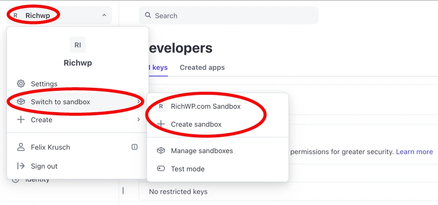 Decide if you want to setup a live shop or play with a Stripe Sandbox first. If you decide for a sandbox, set one up from the Stripe Account menu: