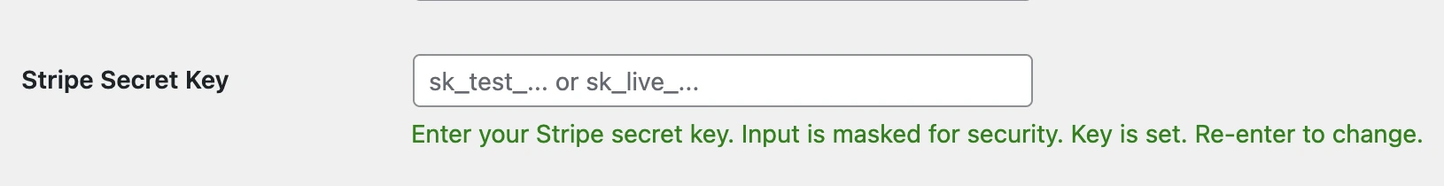 For security reasons, when you save your Stripe API keys, the Stripe Secret key will not be displayed anymore and a green success message will be displayed underneath: