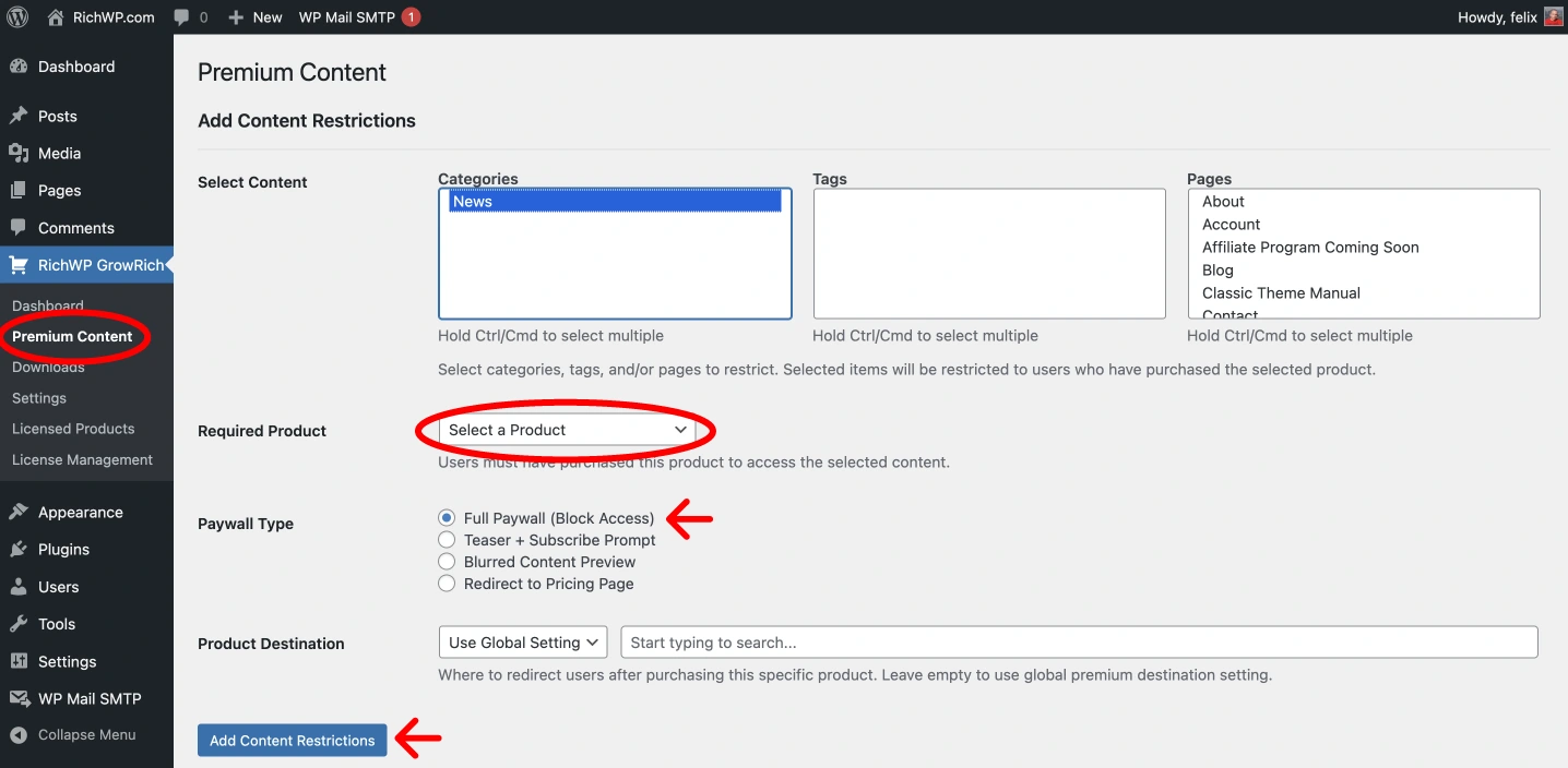 - Back in WordPress, go to RichWP GrowRich → Premium Content