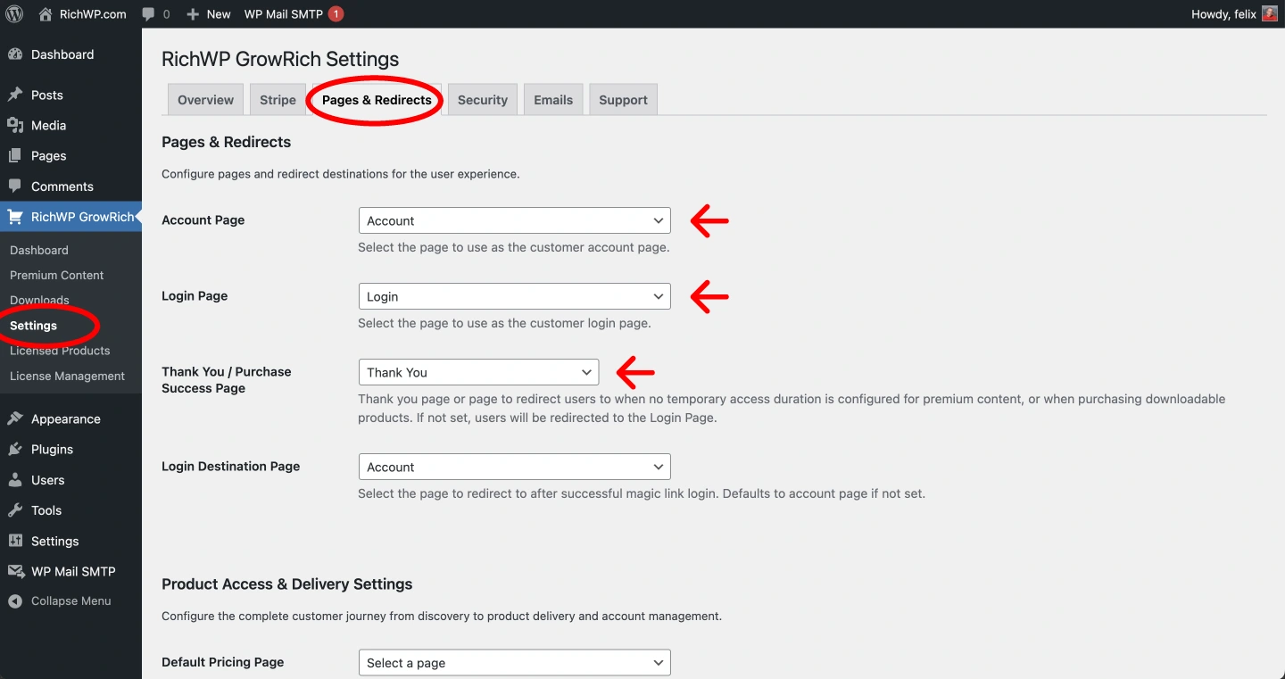 - Go to RichWP GrowRich → Settings and select these pages in the dropdowns