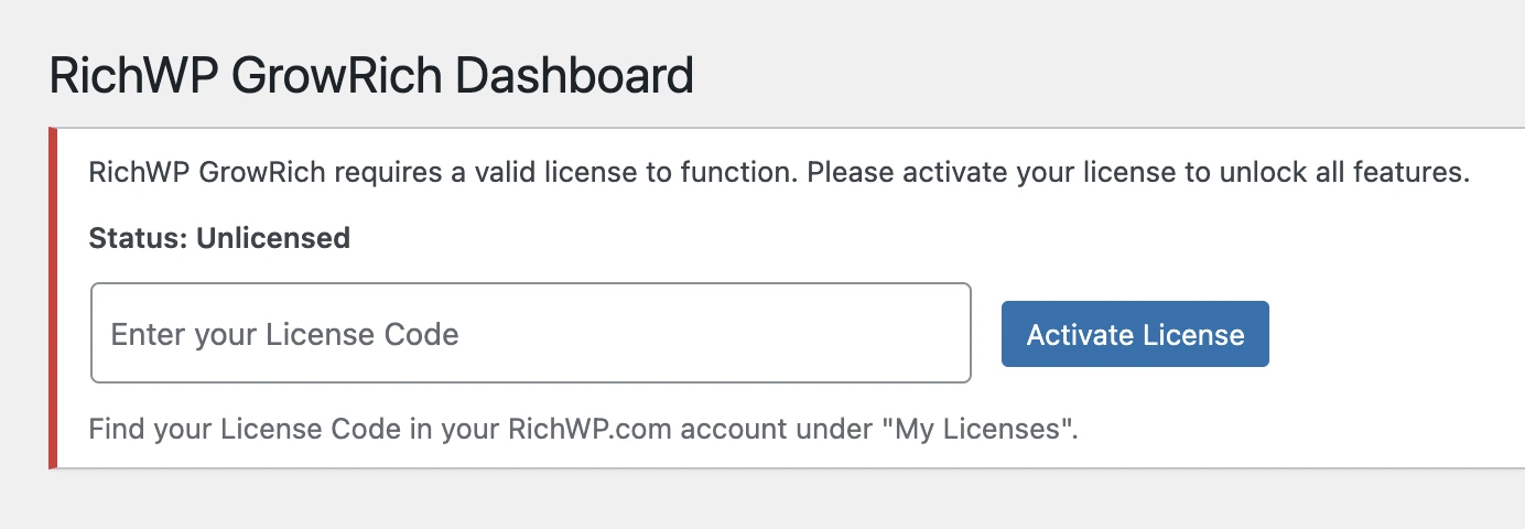 Copy the license code and paste it into the “Enter your License Code” field on the RichWP GrowRich Dashboard, then click “Activate License” to unlock all plugin features.