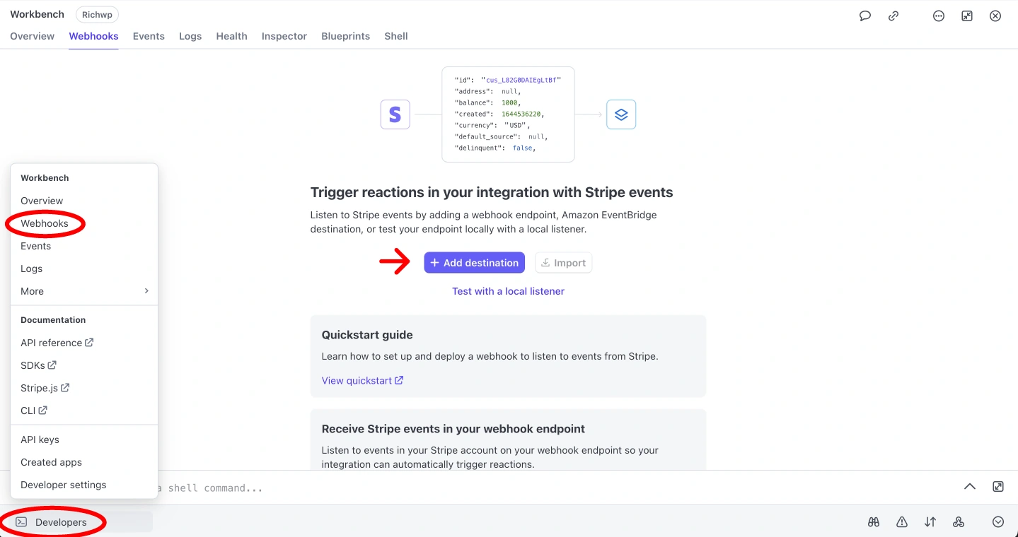 - Navigate to Developers → Webhooks in the left sidebar